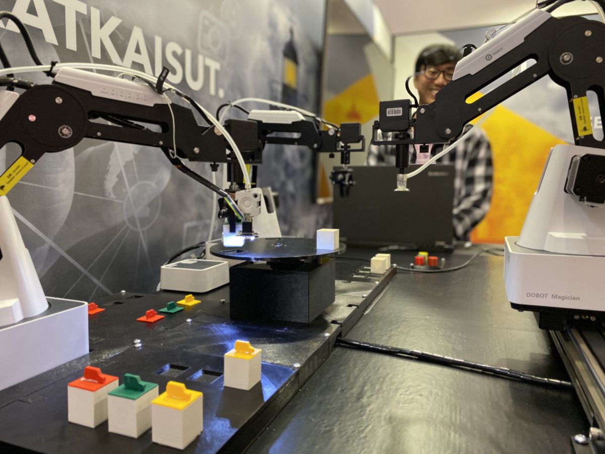 Riihimäellä HAMKin opiskelijat toteuttavat vuosittain satoja projekteja ja opinnäytetöitä työelämän ja yritysten tarpeisiin niin paikallisesti kuin ympäri maailmaa. Koska uudet teknologiat ovat keskeinen osa käytännönläheisiä ja työelämän kanssa tiiviissä yhteistyössä toteutettavia koulutuksia, syksyllä 2019 yksikköön hankittiin InSolution Oy:ltä useita Dobot Magician Educational -opetusrobotteja. Oivalluksia ja oppimisen iloa ei puuttunut, kun opiskelijat saivat mahdollisuuden toteuttaa InSolutionin messuosastolle näyttävän ja kiinnostusta herättävän käytännön esimerkin robotiikan mahdollisuuksista. Aikaa toteutukseen oli vain kaksi kuukautta.